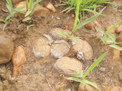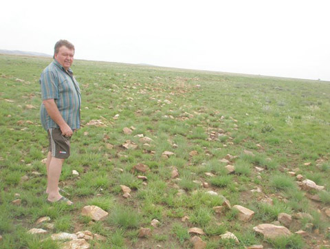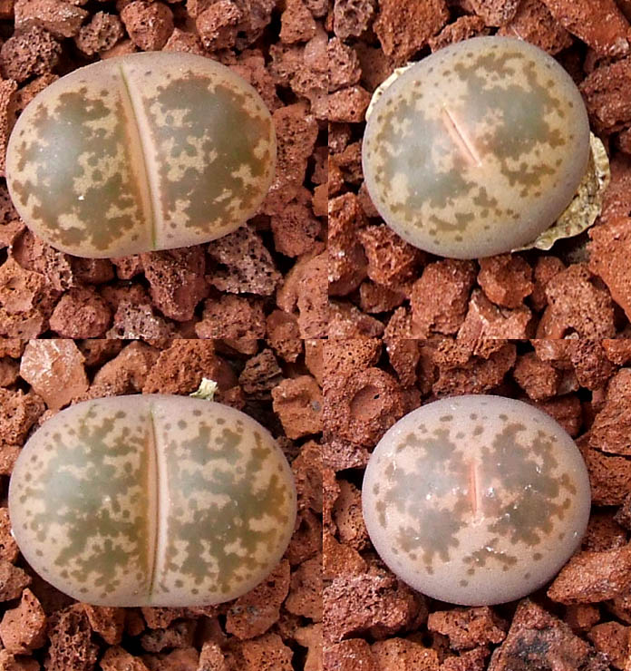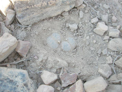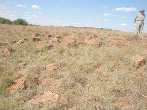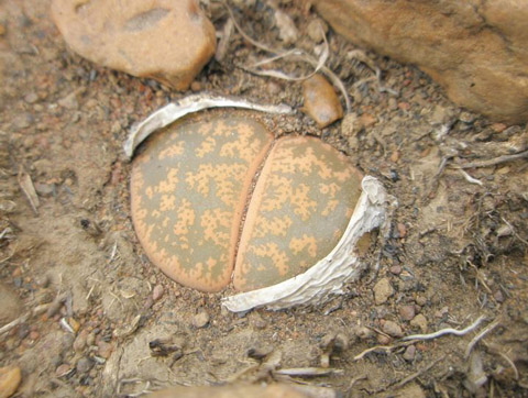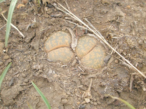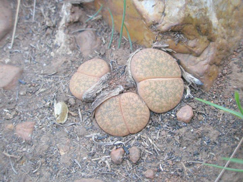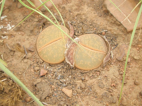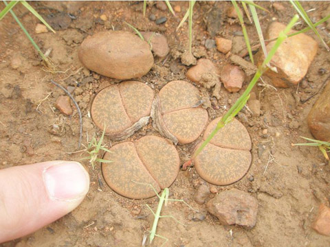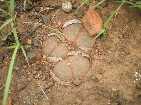 I returned to South Africa in November 2010 and within 24 hours of leaving my home in New Malden, Surrey, found myself in the South African veld photographing specimens of L. Lesliei subsp. lesliei var. minor. I had taken the new rail service from O. R. Tambo Airport (the Gautrain) and had been met at Sandton Station by Naureen and Professor Desmond Cole who wasted little time in driving me north of the Magaliesberg Mountains to a meeting with Will du Toit, who is a mutual friend. Will is a Lithops grower and resident of this area who I had “nagged” from the U.K. into searching out the C006 locality which I thought grew near to his home. At least it did not look far on the map, but I was soon to learn that the reality was quite different. After driving over 100km we turned off the tarred road and drove for some time more on gravel until we reached a farm entrance where the farmer was waiting to greet us. Will had indeed searched out this locality the previous March and made a date with the farmer to show this “Mad Englishman” the Lithops on his land. When Will had visited in March 2010 there had been good rain and plant bodies were numerous, but a prolonged drought had followed and had it not been for rain a few days prior to my arrival it is unlikely any plants would have been visible. However, visible some were and after a cross-country drive Will pointed me in the right direction and sent me searching for Lithops. Fig 01 shows a view of the locality with Professor Cole standing top right. I failed to find any Lithops, but with his experience in the veld Will spotted the tell-tale sign of a buried specimen and brushed away some dirt to reveal two pale heads of Lithops lesliei subsp. lesliei var. minor (fig 02). The heads were quite turgid but had not yet reached up enough to find daylight; hence the coloration was unlike the subsequent specimens we found who had reached the light and were a more pinkish, dark-grey hue. All of the heads we found, be they single or multi-headed, looked deceptively dainty as can be seen in fig 03 where we used Will’s index finger as a size comparison. We found several specimens and figs 04 and 05 show another two examples of 3-headed and 2-headed plants beautifully adapted to their habitat. This locality is not exactly the spot the Coles first collected var. minor C006 (perhaps forty years previously), but is an extension of that locality growing on the neighbouring farm. The colony is quite remote so probably will remain safe from humans for the foreseeable future. I am very grateful to Will and his family for their extensive efforts in leading us to these plants.
