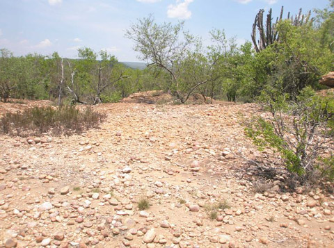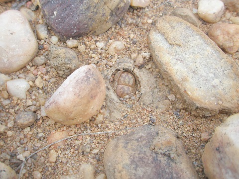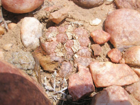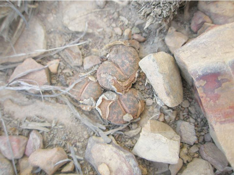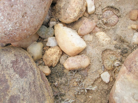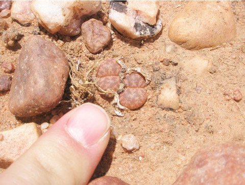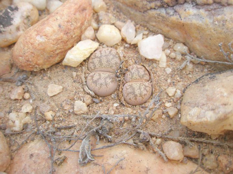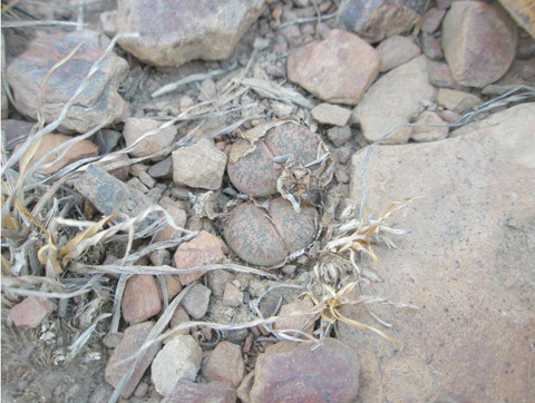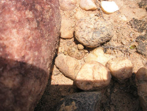 Naureen, Desmond and myself next visited Limpopo province (the old Northern Transvaal) and the only confirmed locality of L. coleorum (named for my two companions) which is C396. This is a most unlikely place to find Lithops, located as it is among continuing bush-veld. The temperature was 43 degrees C. when we met our contact and were led to see our first specimens of the day. I was expecting an isolated koppie, but we were led down a slope to a second site where L. coleorum has also been found. The spot is close enough to the initial find site to be considered an extension of the same colony, but none the less represents a significant increase in the habitat range. It also increases the chances of this species being more widespread than was first thought. The little plants were quite charming and almost identical to specimens I have seen in cultivation, although more compact in size as can be seen in fig 06 where my index finger can be seen as a comparison. We were then shown to the initial find site (fig 07) where we found several more specimens. Fig 08 shows a lovely multi-headed plant which almost exactly matches the colouration of the habitat pebbles, and figs 09 and 10 show two more pristine habitat plants of 2 and 1 head respectively which match the soil colours as well. The rocks surrounding the plants were too hot to hold, and there had been little rain in the area preceding our visit. I was surprised at how exposed the plant bodies were given the fierce heat of the day, yet showed no sign of stress and sported many seed capsules. In habitat these incredible little plants grow for the most part unnoticed by the local human population.