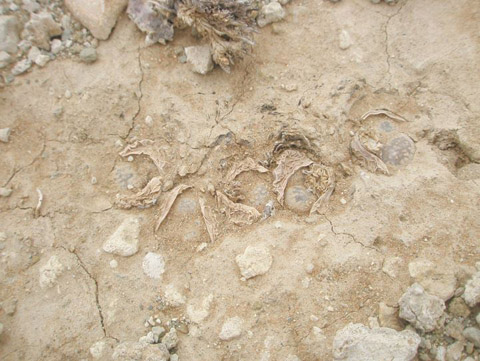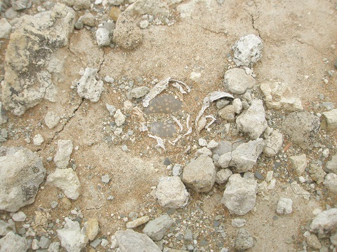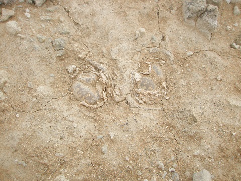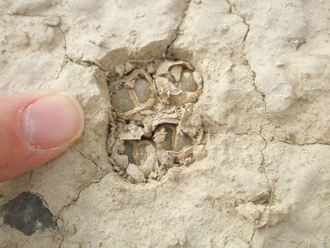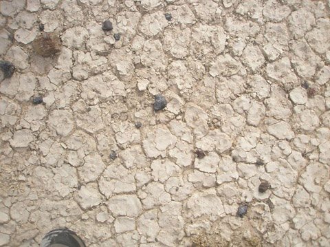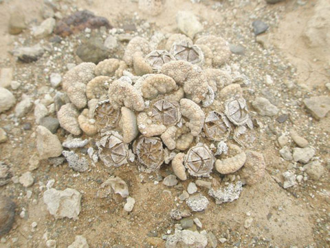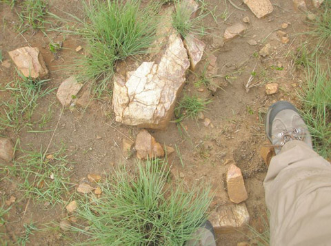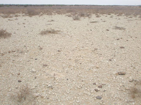 The last species of Lithops we found on this trip was also my first habitat “white”. Naureen undertook a 1200 km round drive down into the Free State where we found two localities of L. salicola. On arrival in Luckhoff we took the first (? only) guest house we found and later that evening met the owner who turned out to be a local farmer. He did not know anything of “beeskloutjies” but made some phone calls to his neighbouring farmers who did know of them. Not only that but he made arrangements for us to meet with one of them the following morning who would take us to two localities, one of which was actually an extension of the L. salicola type locality, C34. The only slight problem from my personal perspective was that our contact would only speak Afrikaans, but with the Coles at my side this was only a minor issue. The first locality we were led to was a non C-numbered site to the south of C34. There had been no rain in this area since before the winter (at least six months, probably more) and the brackish clay pan where the plants live was baked solid. L. salicola was visible though and our young farmer soon pointed out some withdrawn specimens that were seemingly cemented into the clay (fig 16). Come the rains however this area would soften, the plants swell, flower and fruit before retreating back into the safety of the clay as the area again dried out; perfect adaptation. In keeping with the finger theme of this article fig 17 shows my index finger next to the most conspicuous specimen we found. The terrain of the type locality C34 was slightly different, the clay being covered with a layer of pebbles (fig 18). With permission from the farmer we climbed through a barbed wire fence to search and to my surprise quickly found Titanopsis calcarea (fig 19 shows a particularly butch example). We also found L. salicola but these were much harder to locate deeply embedded as they were in the dry mud (fig 20). This was the last locality of our trip and the long return journey began.