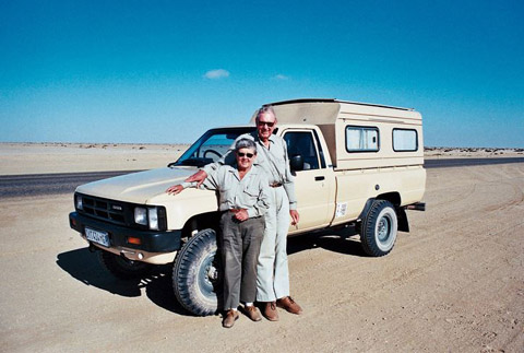 Figure 01 - My hosts Naureen and Desmond standing beside “Bokkie”, their tried and trusted 4X4 on the road from Swakapmond to Hentis Bay, 27-10-2007.