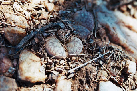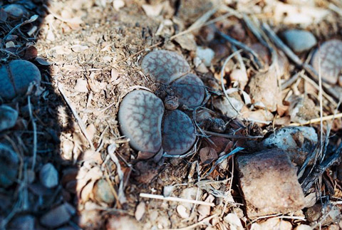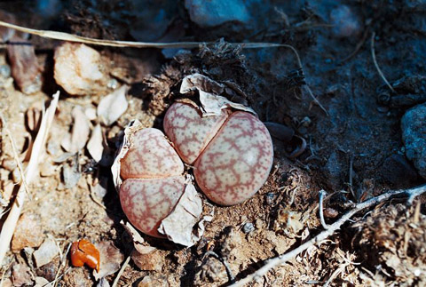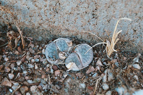 Figures 02–06 - Individual examples of L. pseudotruncatella subsp./var pseudotruncatella from the same locality near Windhoek. This colony grew for the most part under the partial shade of a spiky African Acacia tree (hence the somewhat dappled images), although one individual grew beside a breeze block (figure 05) and several others were far more exposed to the hot sun. Although there were numerous specimens here, they were much localised and I estimate that I could have strolled into and out of the growing area in a dozen or so steps. The natural variation of var. pseudotruncatella is quite evident in the pictures, yet all were well camouflaged in their natural setting, something that is really remarkable to see at first hand. I am also pleased to say that there was no shortage of seed capsules.