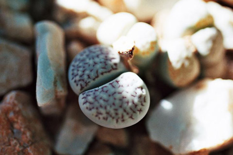 Figure 07 - The reticulate form of L. amicorum. This plant was in the private collection of Tok Schoeman who lives in Windhoek, and although is no more than a normal variant was new to me. Tok grows most of his Lithops grouped together in trays surrounded by natural stones (although not in habitat collected soil), and the effect is most pleasing.