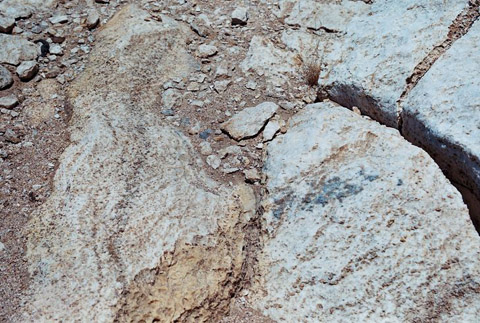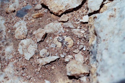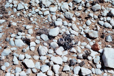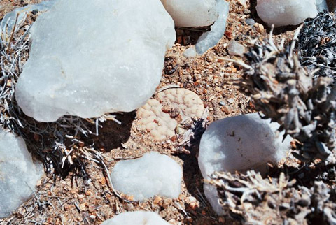 Figure 10 - A single L. gracilidelineata subsp./var. gracilidelineata in its remote quartz strewn locality. The plant was extremely cryptic as can be seen by this image that was taken from a kneeling height. Conditions here were also bone dry and extremely unfavourable for Lithops hunting, yet Naureen once more spotted this specimen after extensive searches by us all. No doubt other specimens are again within frame but withdrawn from view due to the severe drought conditions. Note the “fuscous” stone to the right that mimics ‘Café au Lait’.
