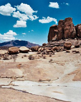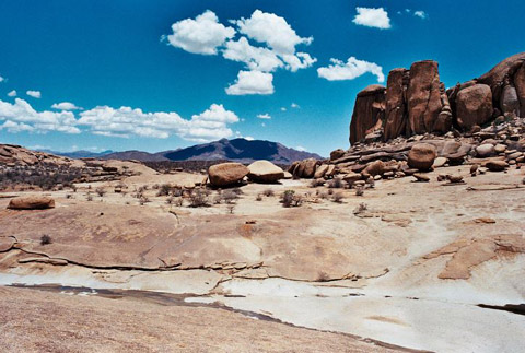 Figure 12 - The spectacular type locality of L. werneri. No drought conditions here but unfortunately we failed to find any specimens and we must now accept that this species may be extinct in the wild. The story banded around is that the colony had been wiped out by a severe thunderstorm that swept away the soil from the shallow depressions in the rock where the plants grew. However, as L. werneri had no doubt been growing at this locality for thousands of years we cannot discount the possibility that someone has dug them all up and invented an alibi! Whatever the cause the implications are obvious to all who cultivate L. werneri. We must pollinate our charges carefully (no hybrids) and distribute the seed and resultant seedlings responsibly. We should of course do this with all our Lithops but here we have an especially important case.