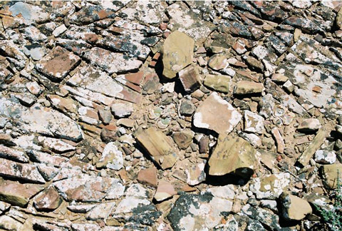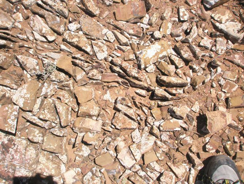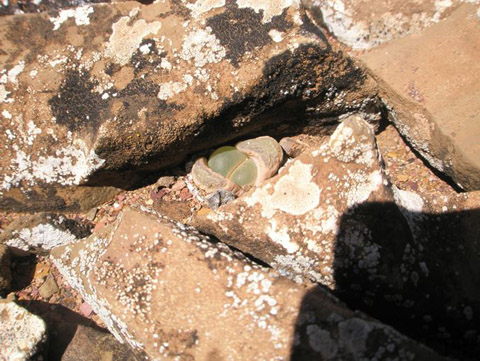 The stones among which the plants grow (and sometimes appear to be wedged) are shale, which at this locality generally present with either a grey-green or a rusty-red colour. Many of the fragments manifest both tones in differing degrees, sometimes with intermittent shades of buff, cream or brown also being present. Naureen pointed out that some rocks had what appeared to be a white lime encrustation on them, which was further interspersed with patches of grey-green lichen. Somewhat surprisingly to me I found all of these colour tones present in each of the L. viridis I saw at this locality in some degree or other. The green faces of the new growth matched with the grey-green shale, and the withering old leaves were often tinged reddish to match with the rusty-red shale. White (many seed capsules appeared white) or cream patches were also present in the withering leaves, which again matched perfectly with either the lime encrustations or the natural colour of the substrate and other parts of the shale. Further, the plants habit of growing beneath the level of the rocks not only seems to provide protection from the mouths and feet of large animals, but serve to break up the general appearance of the terrain further by casting tiny shadows. The combination of all these factors results in a very cryptic appearance that beautifully and effectively camouflages L. viridis by way of colour and texture. I do not know how the plants maintain their camouflage through all the seasons, but I somehow feel sure they do the job rather well.